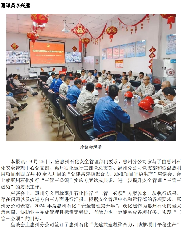 惠州分公司與業(yè)主開展 “黨建共建凝聚合力,助推項目平穩(wěn)生產(chǎn)”座談會