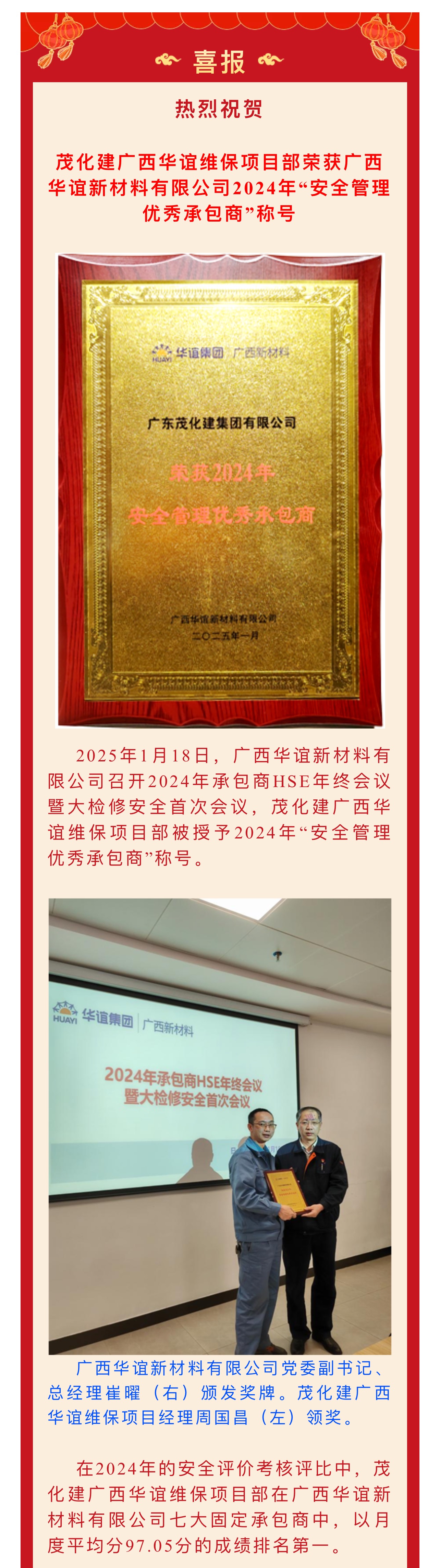 喜報(bào)|榮獲廣西華誼2024年“安全管理優(yōu)秀承包商”稱(chēng)號(hào)